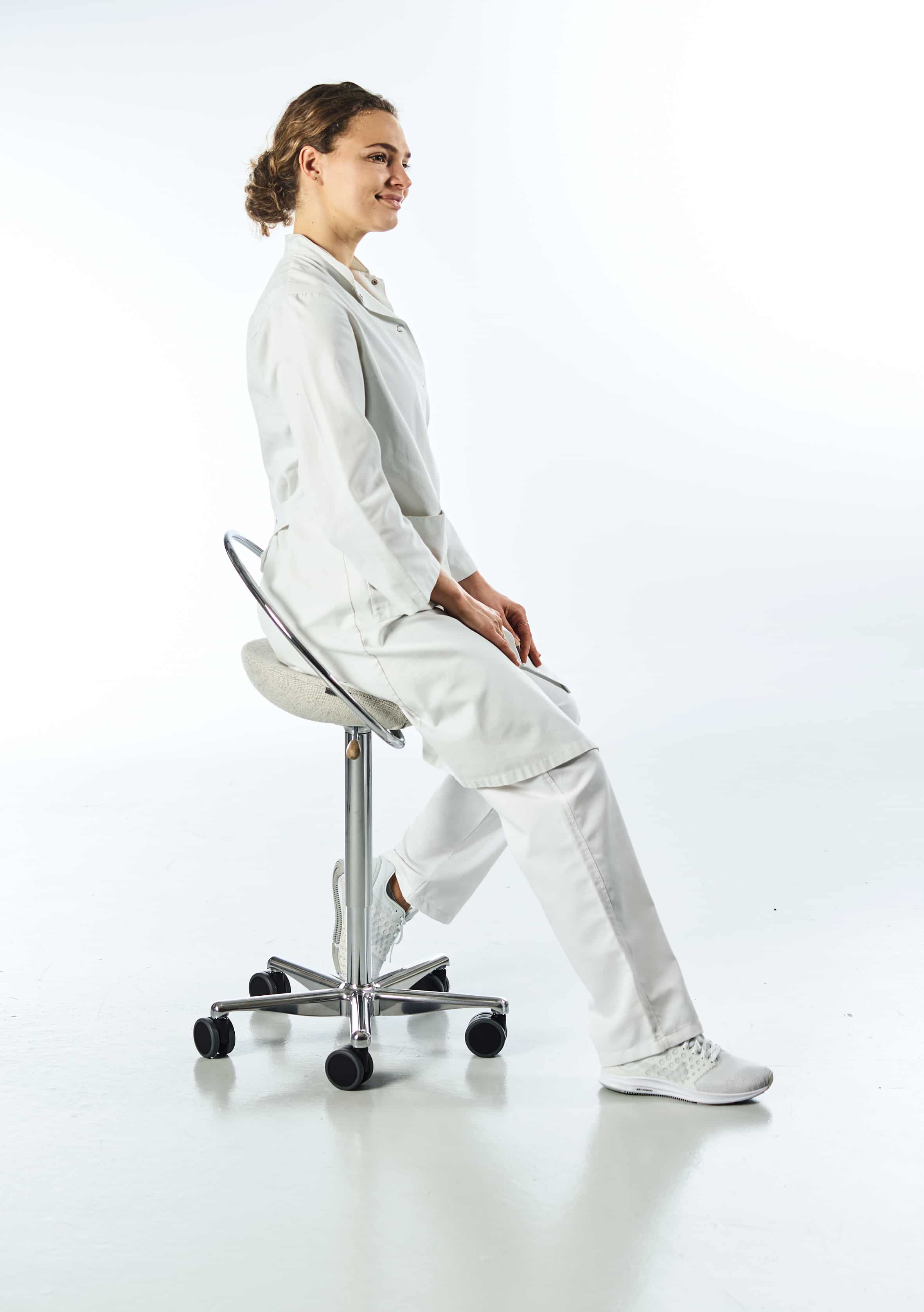 Våre laboratoriestoler er ikke bare komfortable å sitte på – de styrker faktisk kroppen din mens du jobber. Stolens design inviterer til naturlig bevegelse, noe som fremmer blodsirkulasjonen og hjelper deg å holde fokus hele dagen. Samtidig støtter den kroppen i en sunn sittestilling, og forhindrer belastning på korsrygg, nakke og rygg – utfordringer som mange kjenner fra stillesittende eller ensidig arbeid i laboratoriet.
